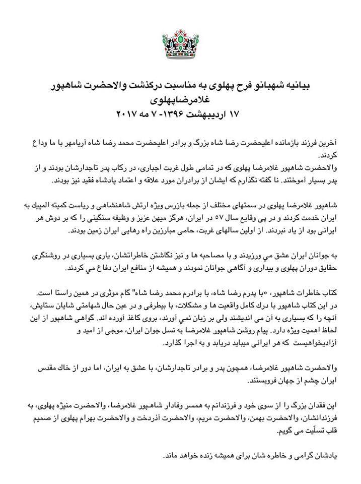 Following the death of his half-sister Ashraf Pahlavi on 7 January 2016,[1] Gholamreza became the only living child of Reza Pahlavi. He resided in Paris with his family. He died on 7 May 2017 at the age of 93, eight days before his 94th birthday.